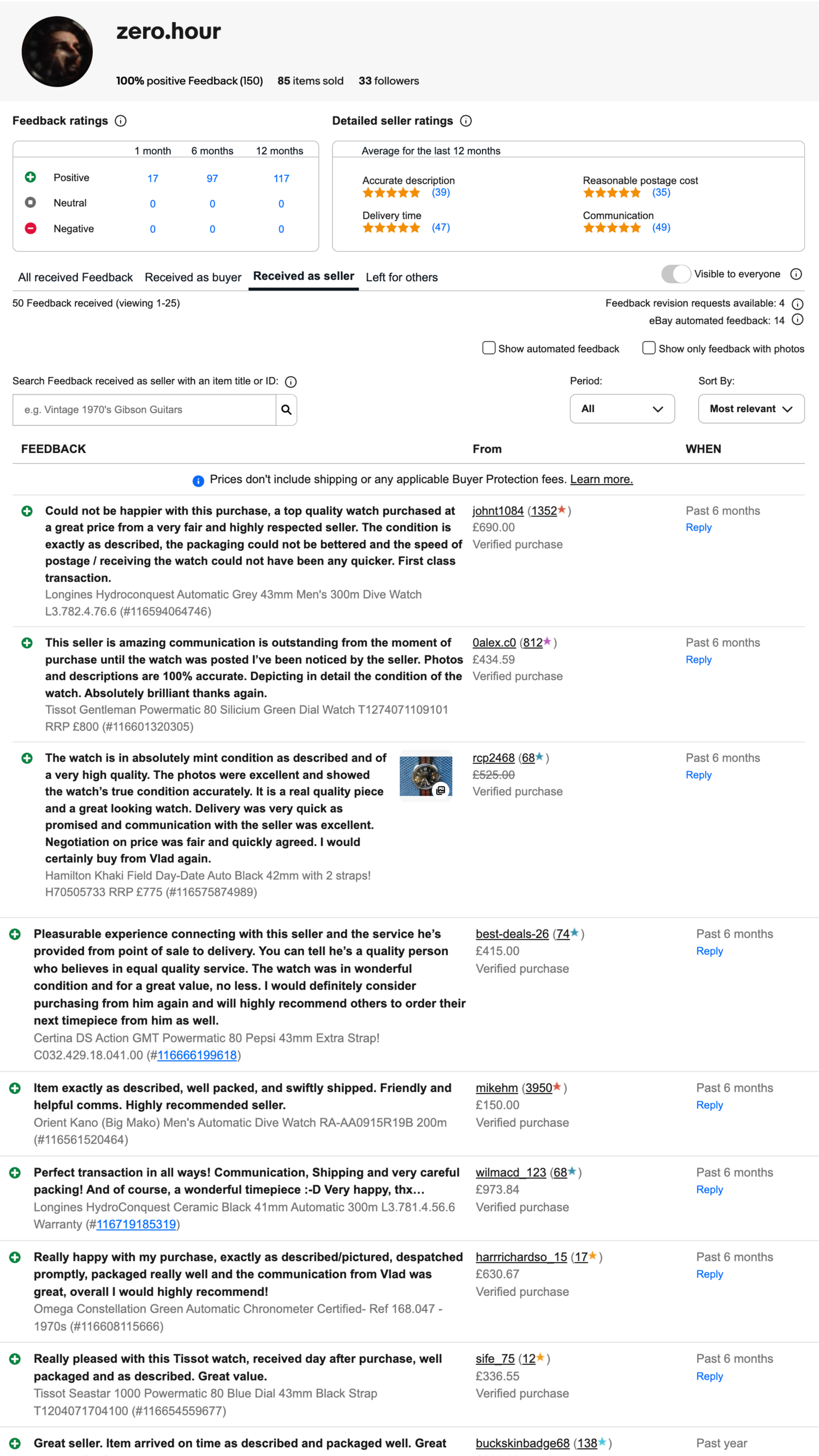 100+ authentic watches sold globally on platforms such as eBay, Chrono24 and Vinted.